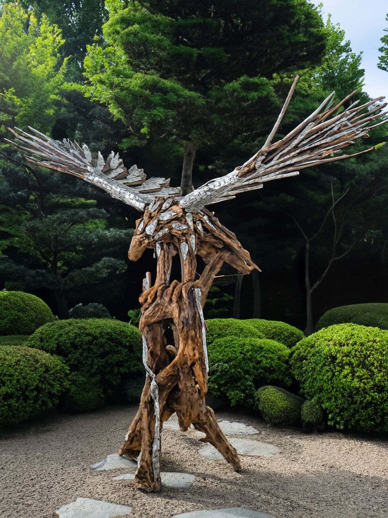 Dieser Adler wird aus Teakwurzeln gearbeitet und mit Aluminiumteilen veredelt. Das Ergebnis ist eine sehr schöne Kombination aus dem Jahrtausende alten Werkstoff Holz und dem eher modernen Werkstoff Aluminium. Jede Figur aus dieser Serie ist ein echtes Unikat. Dadurch, dass die naturbelassenen Teakwurzeln stets unterschiedlich sind sieht jedes Ergebnis etwas anders aus.